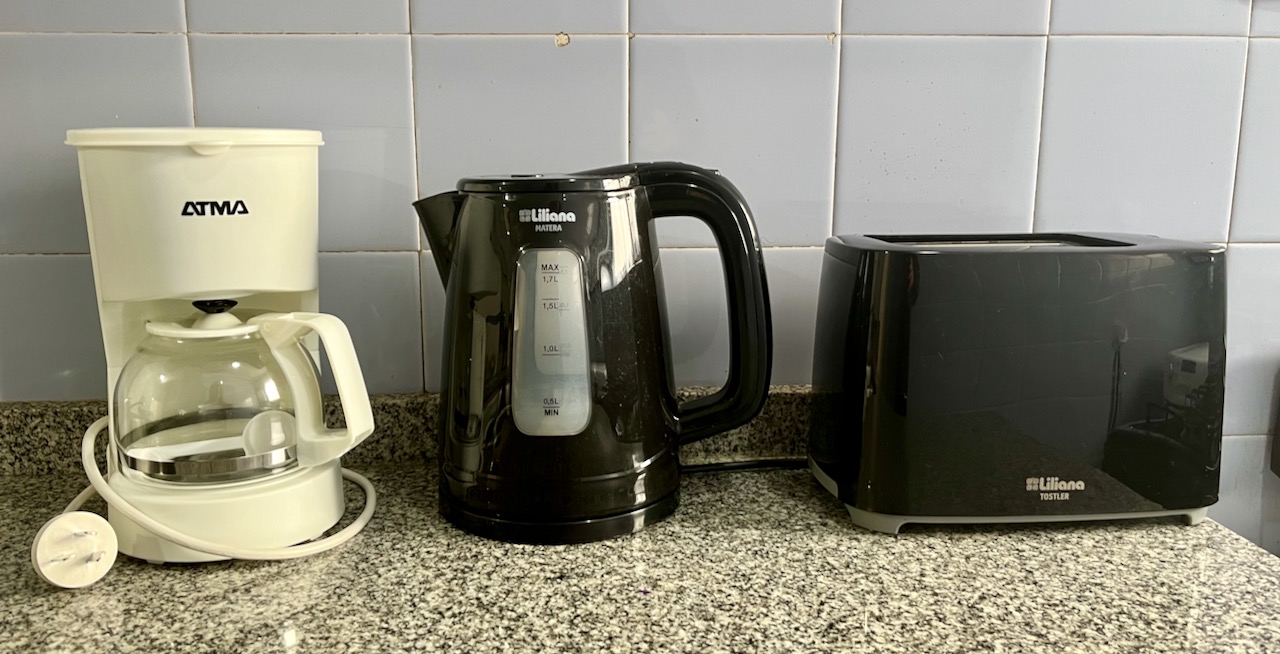 🍽️ Cocina completa con microondas, horno eléctrico, tostadora, cafetera, pava eléctrica, cocina heladera con freezer, utensilios y vajilla.